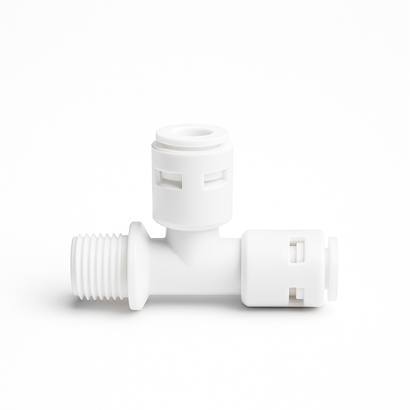 Фитинг изготовлен из пищевого пластика, разрешённого для контакта с питьевой водой, и оснащён прочными зажимами, которые обеспечивают стабильную фиксацию трубки без протечек. Конструкция рассчитана на рабочее давление до 8 атм, что делает тройник надёжным элементом системы водоочистки.